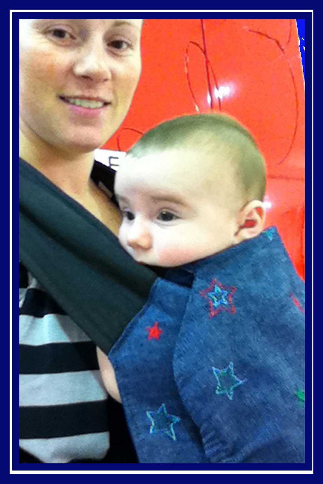 I needed some fabric first, so I dragged my patient husband to Spotlight in search of some suitable fabric for the body of the carrier. I was thinking along the lines of denim and was super lucky to find some denim fabric in the clearance section, bargain! For the waist band and shoulder straps I used some dark brown corduroy that I had at home left over from a cowboy vest I made for a friend's son a while ago. I padded the waist & hip area with polar fleece, as well as the shoulder area. Cut the denim fabric to shape including a hood and then sewed it all together.